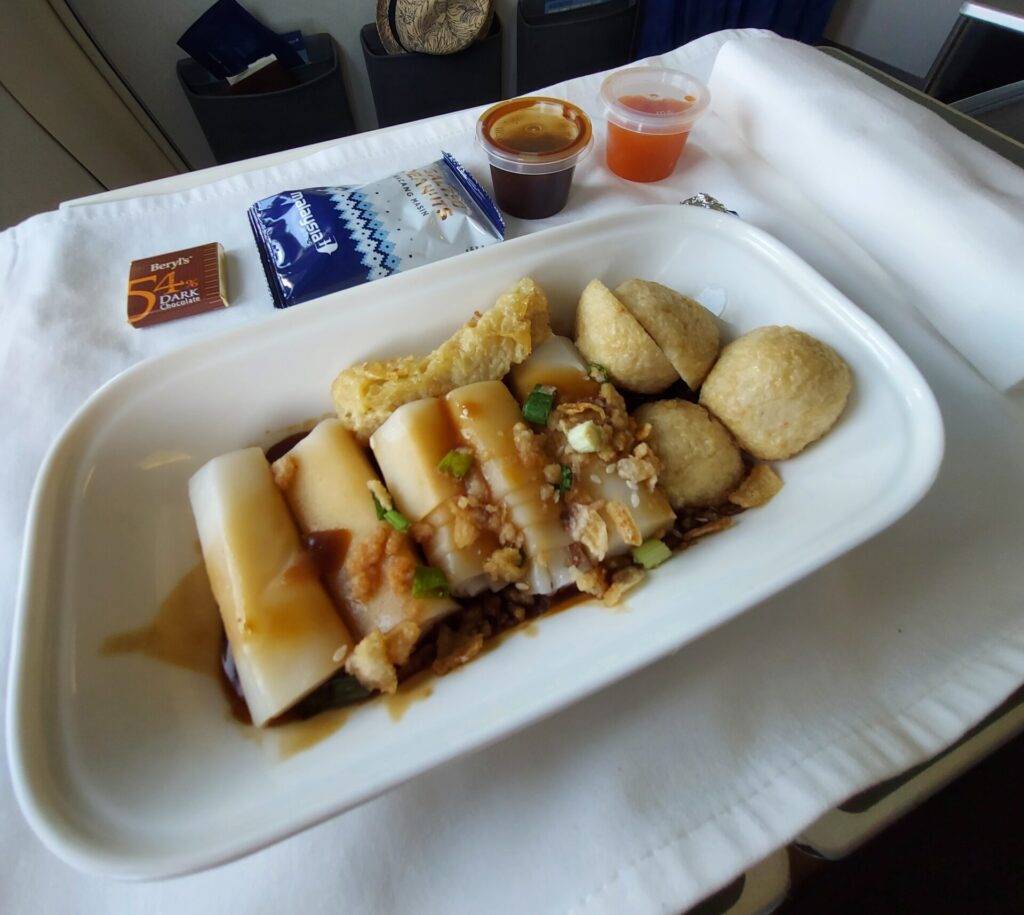 Then, as if the Gods had looked fondly upon me, he showed up seat-side and carefully explained (to me, only) what the meal of the day was – a Chee Cheong Fun – before quickly retiring back to his seat in the galley. Quite what I did to afford such a pleasure I will never know, and always be left wondering.